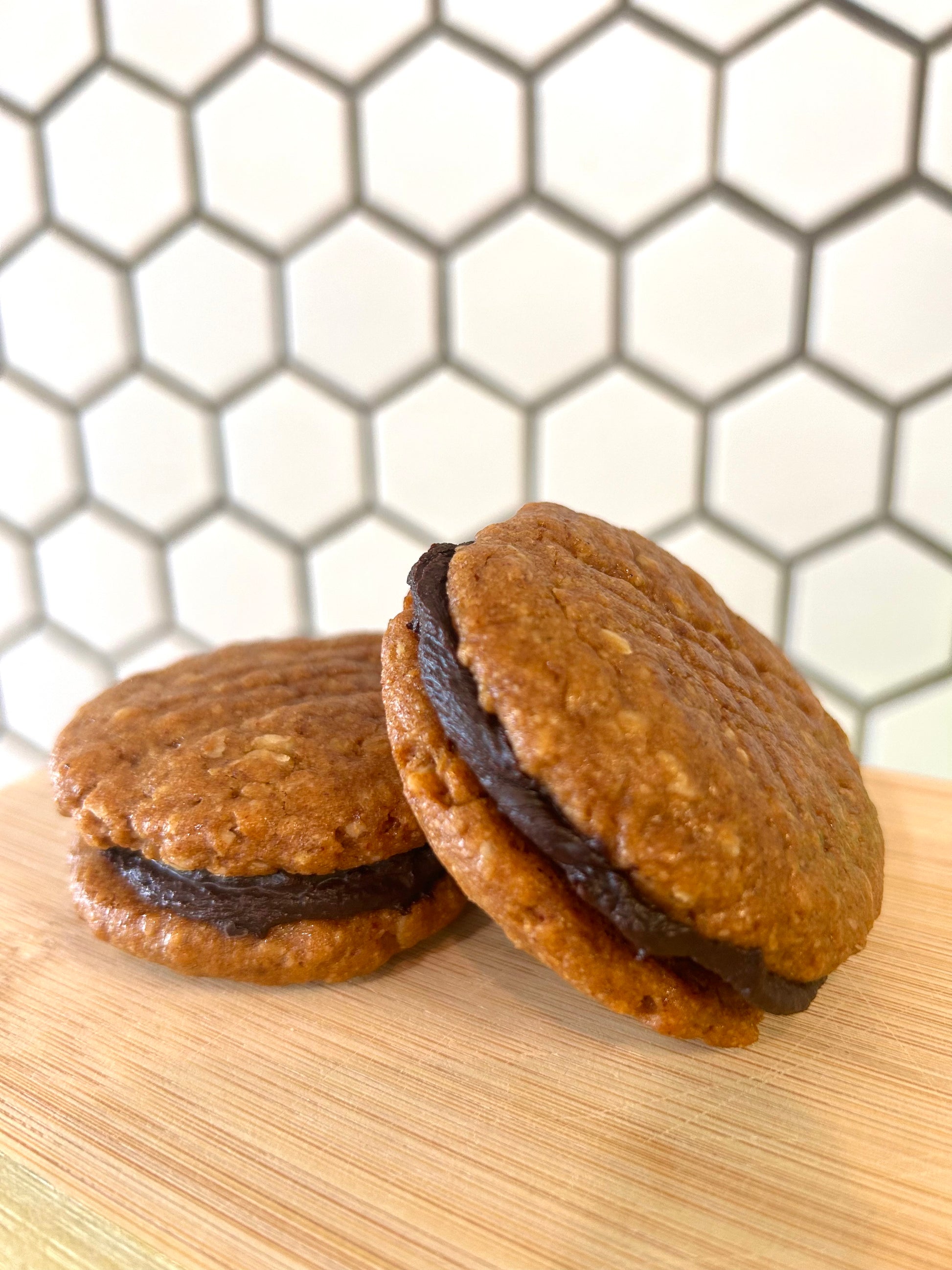 Decadent chocolate filling made with coconut oil and fair trade cocoa, sandwiched between two delicious gluten free peanut butter cookies.